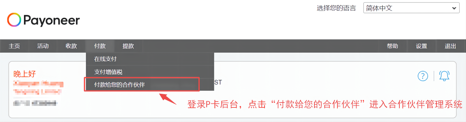 第一步:登录Payoneer卡后台,点击“付款给您的合作伙伴”进入合作伙伴管理系统(VMP系统)。
