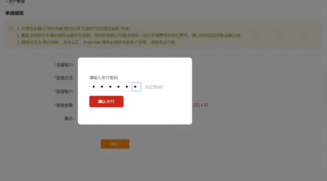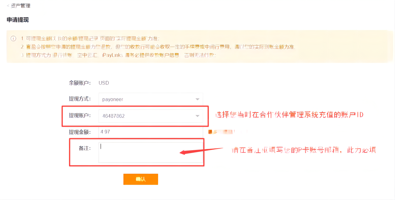 第七步:关于提现:与在赛盈分销平台直接充值不同的是,在合作伙伴管理系统充值的资金关联的是您的P卡账户ID,而非P卡账号邮箱,因此在创建提现单时,请在备注框内填写您充值时的账号邮箱,否则无法提现。