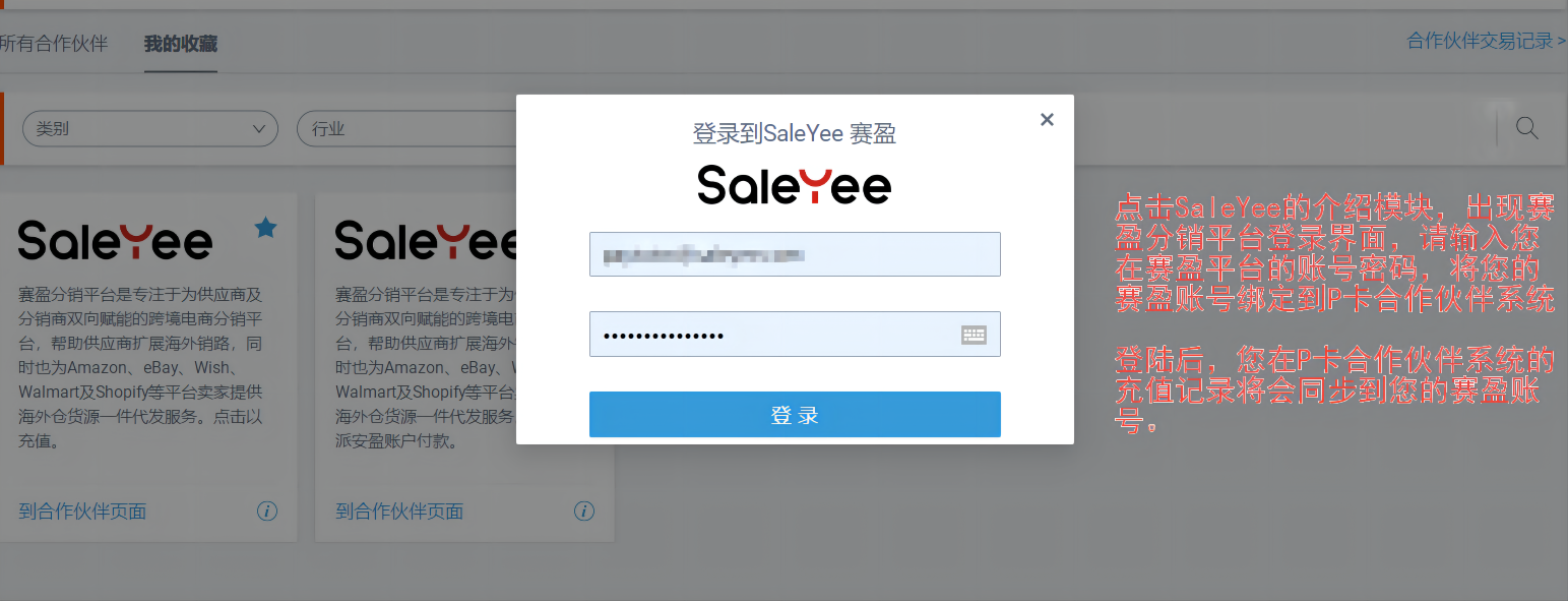 第三步:进入SaleYee页面后,会弹出赛盈分销平台的登录界面,请输入赛盈的账号密码并进行绑定关联,P卡合作伙伴系统的充值记录将会同步到分销商用户所绑定的赛盈账号。