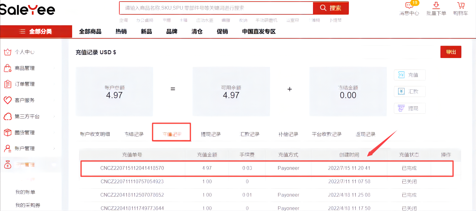 第六步:充值完成后,分销商用户在赛盈的合作伙伴管理页面和赛盈分销平台“我的余额-查看账户”内,均能看到该笔充值记录,实际充值金额=实付金额-支付手续费。