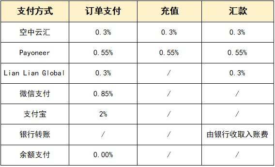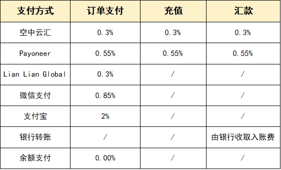 1. 在账户充值或订单支付时,选择不同支付方式将收取不同比例的支付手续费,各支付方式具体收取费用如下: