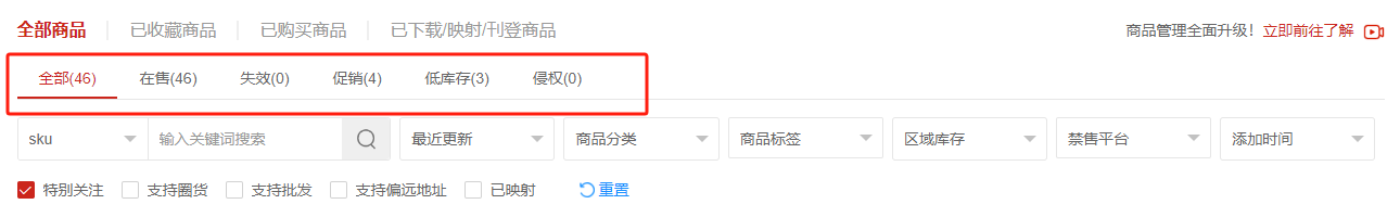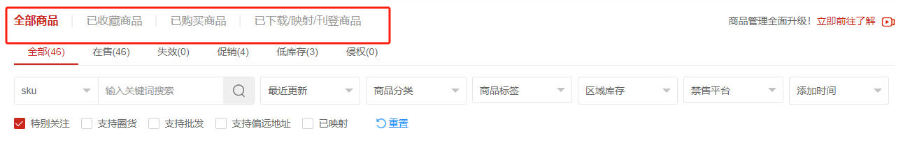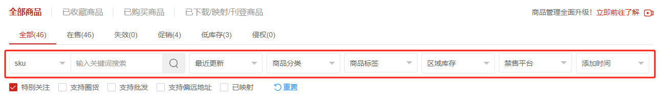 (4)一键筛选特别关注的商品、支持圈货/批发/偏远地址的商品、已创建SKU映射的商品。