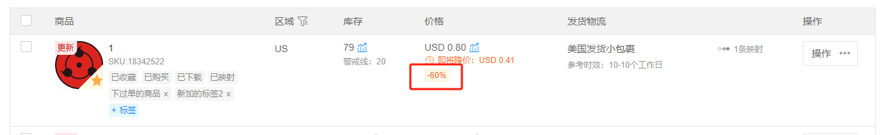 ● 发生了信息变更的商品也会在表格中显示变更标签,商品信息变更(如商品图片、标题、描述、退货地址等信息变更)的标签显示在商品主图的左上角;商品价格变更(涨价/降价/即将涨价/即将降价)的标签会显示在商品价格下方。