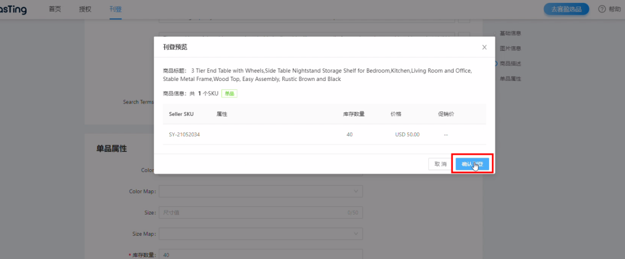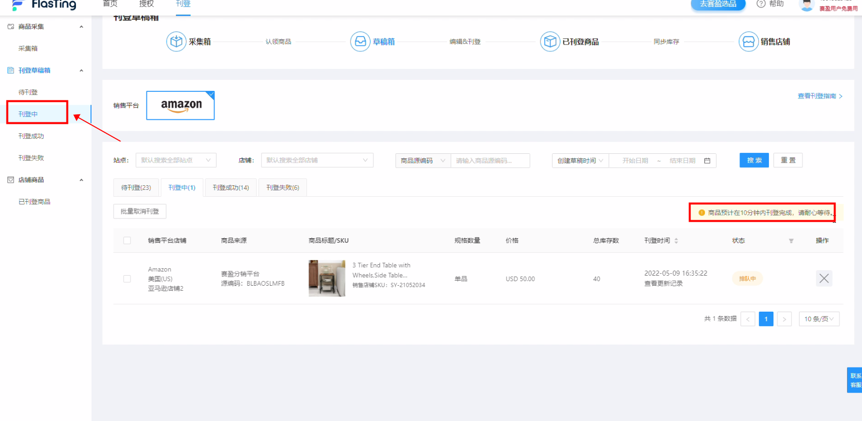④ 商品刊登提交成功后,刊登的商品数据将会进入“刊登中”的列表处,预计10分钟内完成刊登。