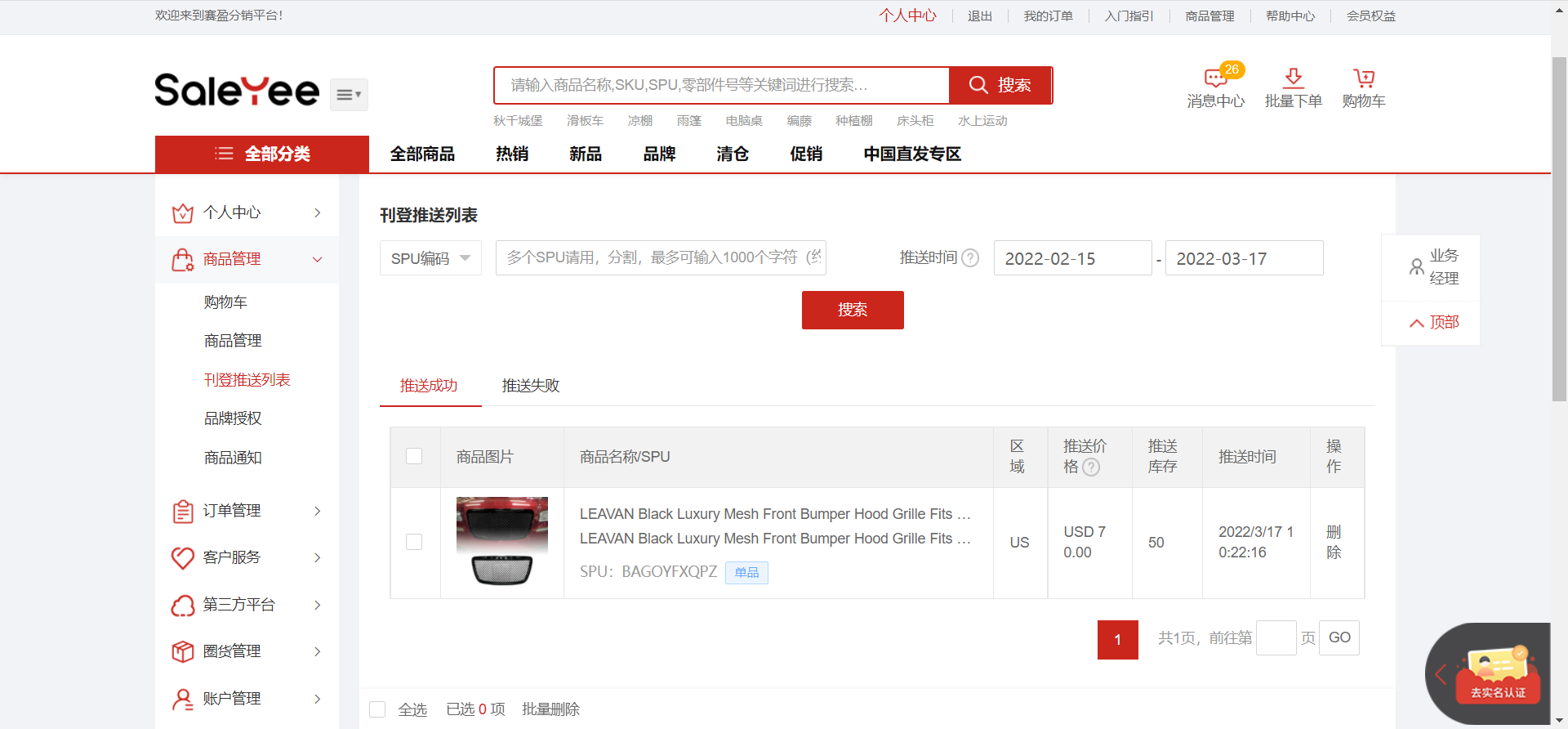 ① 进入赛盈分销平台“个人中心”页面,点击“商品管理”中的“刊登推送列表”,即可查看成功推送到飞刊的商品。