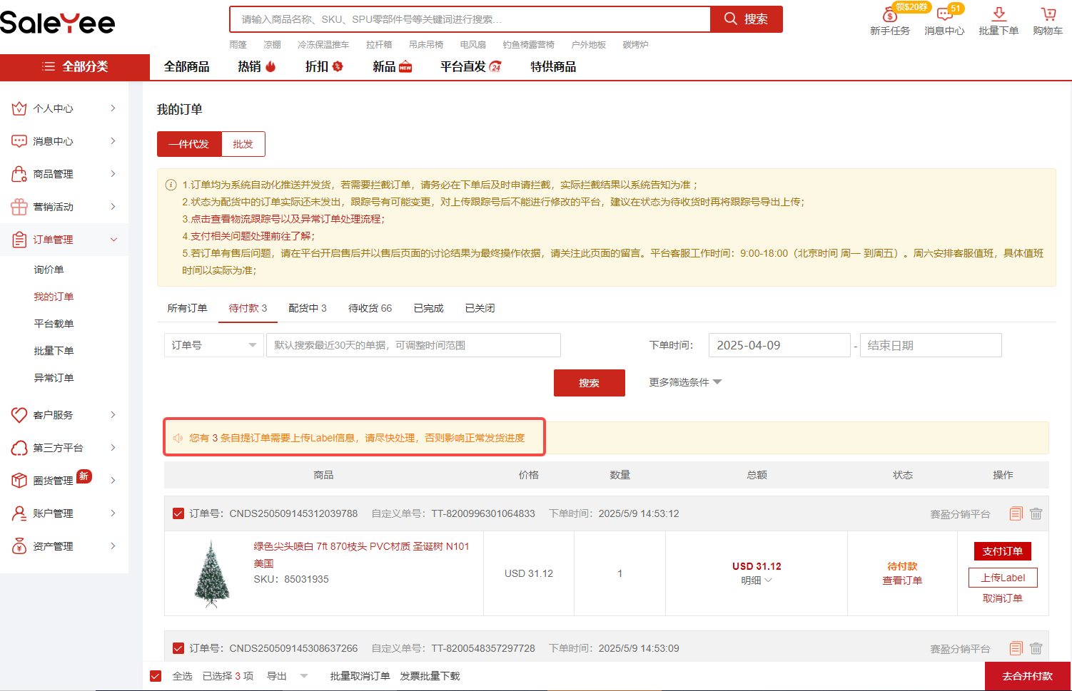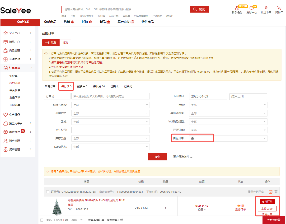 5.上传订单成功后,进入“我的订单”页面,选择“待付款”的页签,同时筛选出自提订单进行后续的Label文件上传。
