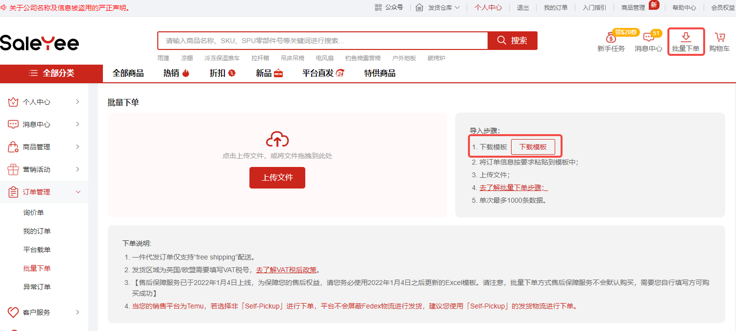 1.点击“批量下单”按钮,进入批量下单页面。点击“下载模版”,下载批量下单表格模版;