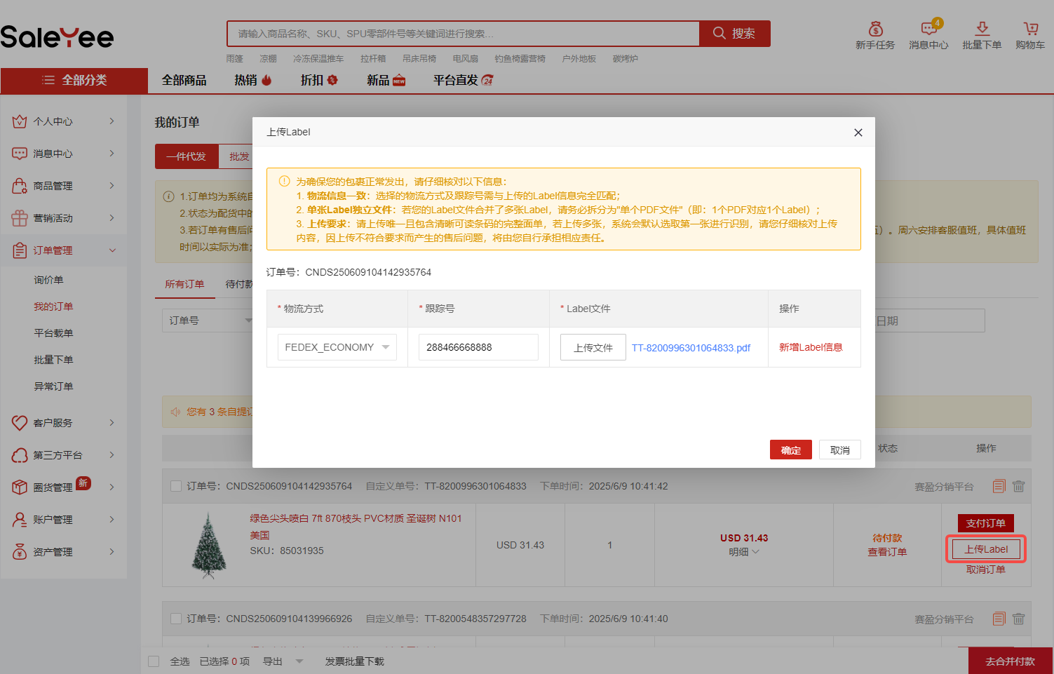 4、Label文件上传数量须严格依据商品详情页中标注的“发货包裹数量”进行提交,避免因Lable文件数量不足导致部分包裹无法发货;