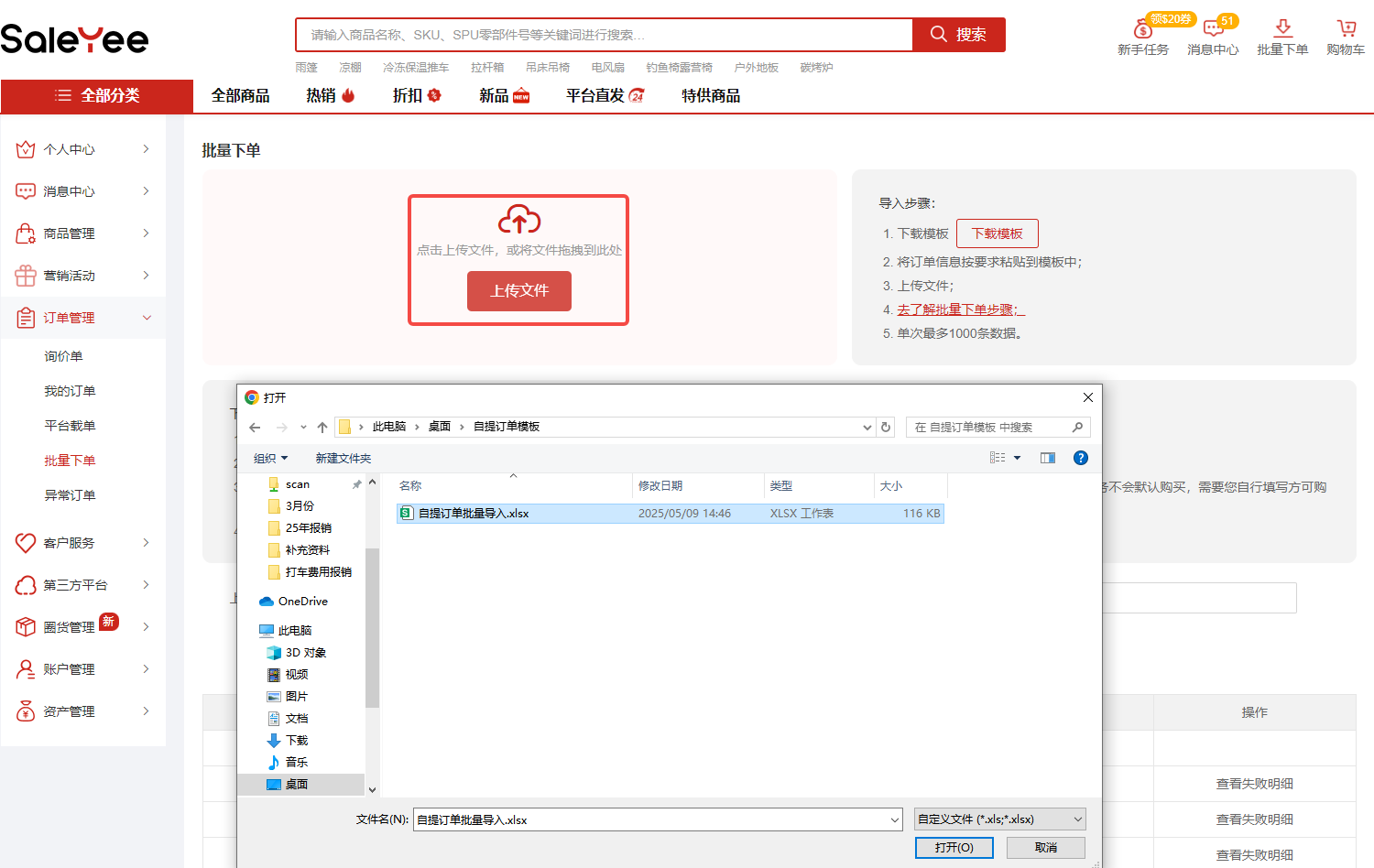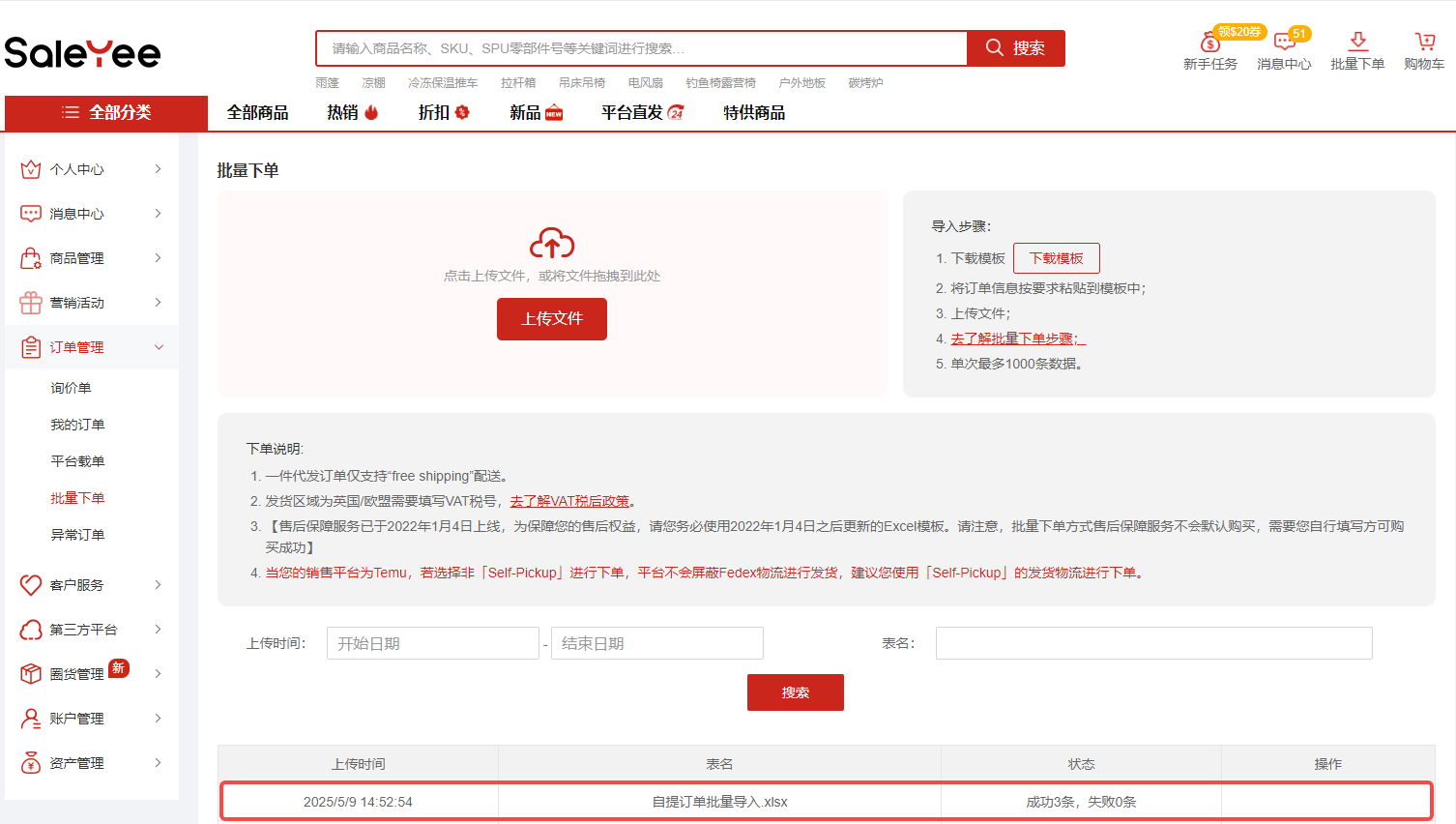3.点击“上传文件”按钮,上传填写好的批量下单表格;