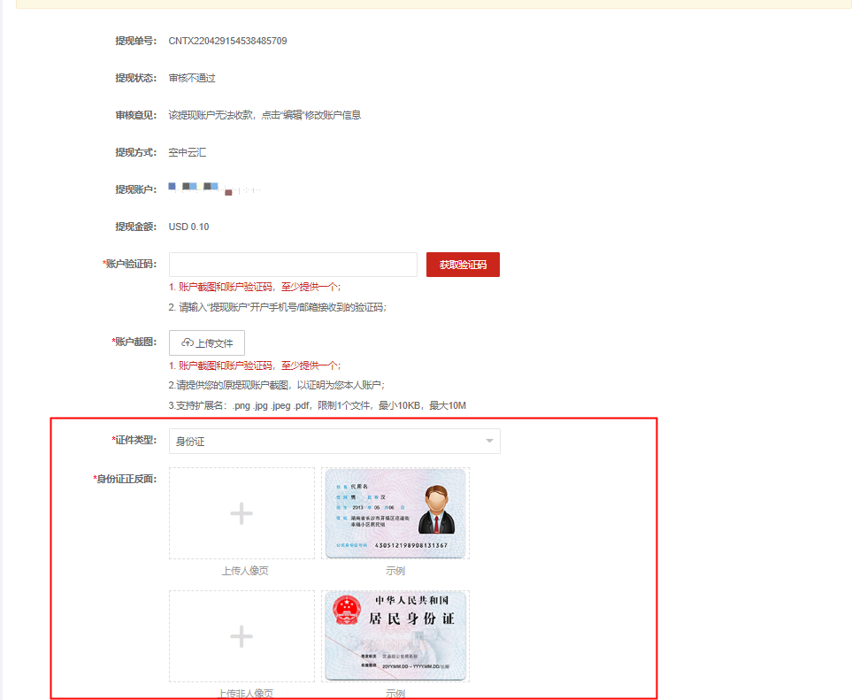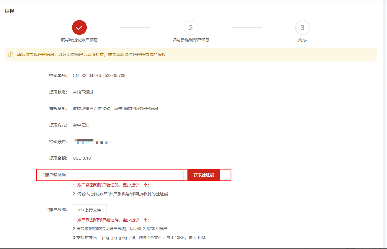 情况2:若该提现账户无法收款,点击“编辑”修改账户信息。补充说明如下: